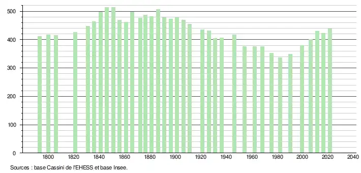 L'évolution du nombre d'habitants est connue à travers les recensements de la population effectués dans la commune depuis 1793. Pour les communes de moins de 10 000 habitants, une enquête de recensement portant sur toute la population est réalisée tous les cinq ans, les populations légales des années intermédiaires étant quant à elles estimées par interpolation ou extrapolation[19]. Pour la commune, le premier recensement exhaustif entrant dans le cadre du nouveau dispositif a été réalisé en 2006[20].