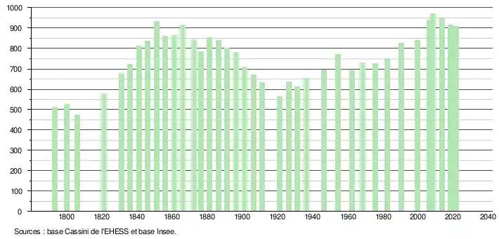 L'évolution du nombre d'habitants est connue à travers les recensements de la population effectués dans la commune depuis 1793. Pour les communes de moins de 10 000 habitants, une enquête de recensement portant sur toute la population est réalisée tous les cinq ans, les populations légales des années intermédiaires étant quant à elles estimées par interpolation ou extrapolation[24]. Pour la commune, le premier recensement exhaustif entrant dans le cadre du nouveau dispositif a été réalisé en 2008[25].
