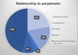 Le viol perpétré par un conjoint, un partenaire ou un ex est souvent assorti de violence physique. Selon une enquête menée dans neuf pays de l'Union européenne, les partenaires ou les ex sont les auteurs d'environ 25 % de la totalité des agressions sexuelles et les actes de violence sont plus fréquents dans ces agressions si elles sont commises par un ex (50 % du temps) ou un partenaire (40 %) que par un inconnu ou par une nouvelle relation (25 %)[51].