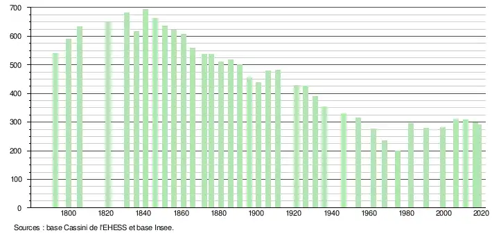 L'évolution du nombre d'habitants est connue à travers les recensements de la population effectués dans la commune depuis 1793. Pour les communes de moins de 10 000 habitants, une enquête de recensement portant sur toute la population est réalisée tous les cinq ans, les populations légales des années intermédiaires étant quant à elles estimées par interpolation ou extrapolation[3]. Pour la commune, le premier recensement exhaustif entrant dans le cadre du nouveau dispositif a été réalisé en 2006[4].