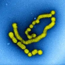 Les virions sont pléomorphes, avec une enveloppe généralement ellipsoïde de 80 à 120 nm de diamètre et peuvent former des filaments atteignant 20 μm de long[29]. L'enveloppe est hérissée d'environ 500 protubérances faisant saillie d'environ 10 à 14 nm hors de la surface du virus. Les molécules d'hémagglutinine sont séparées les unes des autres par des grappes de neuraminidase, avec un ratio d'environ 4 à 5 molécules de neuraminidase par molécule d'hémagglutinine.
