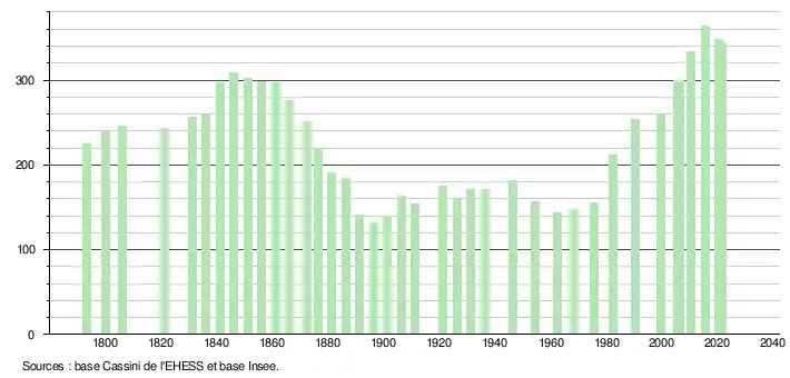 L'évolution du nombre d'habitants est connue à travers les recensements de la population effectués dans la commune depuis 1793. Pour les communes de moins de 10 000 habitants, une enquête de recensement portant sur toute la population est réalisée tous les cinq ans, les populations légales des années intermédiaires étant quant à elles estimées par interpolation ou extrapolation[24]. Pour la commune, le premier recensement exhaustif entrant dans le cadre du nouveau dispositif a été réalisé en 2005[25].