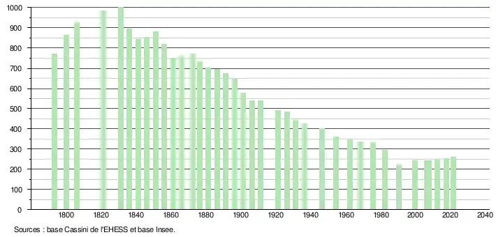L'évolution du nombre d'habitants est connue à travers les recensements de la population effectués dans la commune depuis 1793. Pour les communes de moins de 10 000 habitants, une enquête de recensement portant sur toute la population est réalisée tous les cinq ans, les populations légales des années intermédiaires étant quant à elles estimées par interpolation ou extrapolation[14]. Pour la commune, le premier recensement exhaustif entrant dans le cadre du nouveau dispositif a été réalisé en 2007[15].