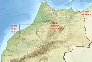 Les principales vignes sont situées dans les régions de Meknes, Benslimane, Berkane, Khémisset, Tiflet et Romani[9]. Le Maroc propose deux appellations d'origine contrôlée (AOC) et quinze appellations garanties (AOG). Elles ont été délimitées en 1977, par un arrêté royal. Il s'agit de Guerrouane, Sidi Zahia et Beni M’Tir (région de Meknès), Angad et Berkane (région de l'Oriental), Chella (région du Rharb), Zare, Zenata et Doukkala (région de Casablanca), Saïs, Beni-Sadden, Zerboune, Zemmour, Gharb et Zaër[10].