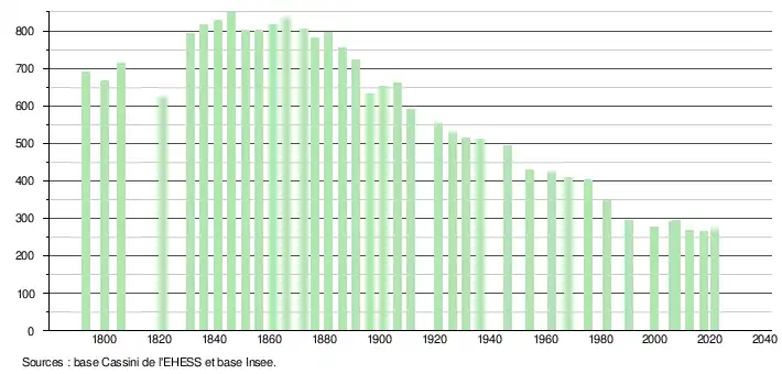 L'évolution du nombre d'habitants est connue à travers les recensements de la population effectués dans la commune depuis 1793. Pour les communes de moins de 10 000 habitants, une enquête de recensement portant sur toute la population est réalisée tous les cinq ans, les populations légales des années intermédiaires étant quant à elles estimées par interpolation ou extrapolation[12]. Pour la commune, le premier recensement exhaustif entrant dans le cadre du nouveau dispositif a été réalisé en 2007[13].