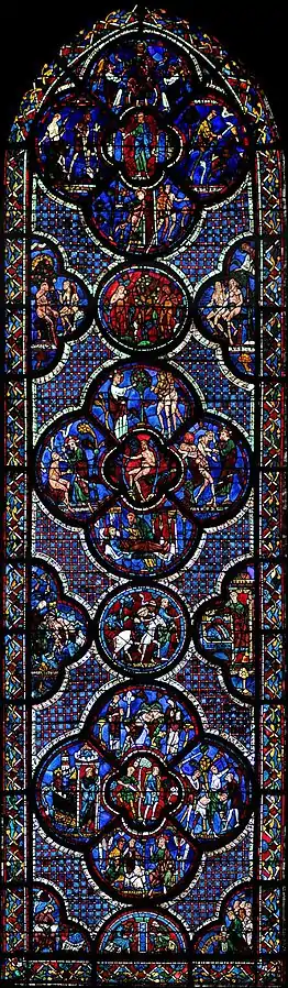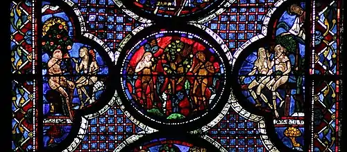 Dans la partie médiane est représentée l'histoire de la tentation et de la chute d'Adam et Ève[Note 2]. Dans la partie supérieure, la dernière scène du vitrail est le meurtre d'Abel par son frère Caïn[Note 3].