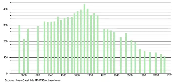 L'évolution du nombre d'habitants est connue à travers les recensements de la population effectués dans la commune depuis 1793. À partir du , les populations légales des communes sont publiées annuellement dans le cadre d'un recensement qui repose désormais sur une collecte d'information annuelle, concernant successivement tous les territoires communaux au cours d'une période de cinq ans. Pour les communes de moins de 10 000 habitants, une enquête de recensement portant sur toute la population est réalisée tous les cinq ans, les populations légales des années intermédiaires étant quant à elles estimées par interpolation ou extrapolation[3]. Pour la commune, le premier recensement exhaustif entrant dans le cadre du nouveau dispositif a été réalisé en 2007[4],[Note 1].
