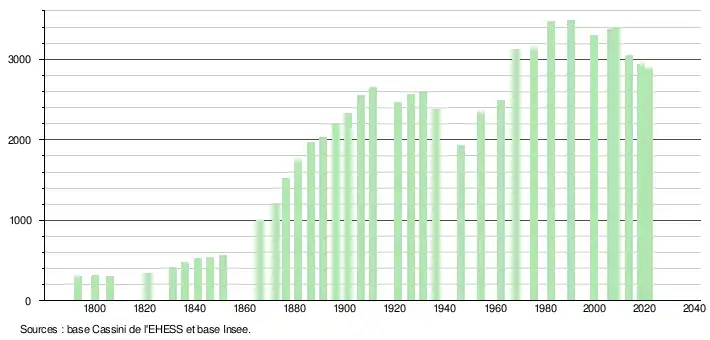 L'évolution du nombre d'habitants est connue à travers les recensements de la population effectués dans la commune depuis 1793. Pour les communes de moins de 10 000 habitants, une enquête de recensement portant sur toute la population est réalisée tous les cinq ans, les populations légales des années intermédiaires étant quant à elles estimées par interpolation ou extrapolation[46]. Pour la commune, le premier recensement exhaustif entrant dans le cadre du nouveau dispositif a été réalisé en 2008[47].