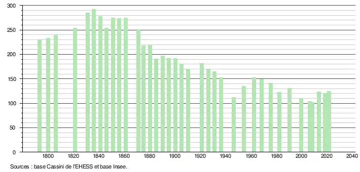 L'évolution du nombre d'habitants est connue à travers les recensements de la population effectués dans la commune depuis 1793. Pour les communes de moins de 10 000 habitants, une enquête de recensement portant sur toute la population est réalisée tous les cinq ans, les populations légales des années intermédiaires étant quant à elles estimées par interpolation ou extrapolation[15]. Pour la commune, le premier recensement exhaustif entrant dans le cadre du nouveau dispositif a été réalisé en 2008[16].