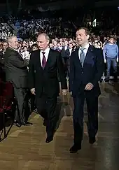 Vladimir Vladimirovitch Poutine (en russe : Влади́мир Влади́мирович Пу́тин [vɫɐˈdʲimʲɪr vɫɐˈdʲimʲɪrəvʲɪt͡ɕ ˈputʲɪn][1] ), né le à Léningrad (aujourd'hui Saint-Pétersbourg), est un homme d'État russe. Depuis 1999, il est la figure centrale de l’exécutif de la nation russe, alternativement comme président du gouvernement (1999-2000 et 2008-2012) et président de la fédération de Russie (par intérim de 1999 à 2000 et de plein exercice de 2000 à 2008 ainsi que depuis 2012).
