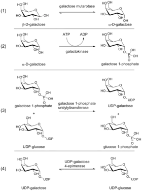 La voie de Leloir est la principale voie métabolique de dégradation du galactose[2]. Elle a été nommée ainsi d'après le biochimiste argentin et prix Nobel de chimie 1970 Luis Federico Leloir. Elle fait intervenir un ensemble d'enzymes qui convertissent le galactose en glucose-6-phosphate, qui peut ensuite être métabolisé via la glycolyse. Ces réactions sont résumées dans le tableau suivant :