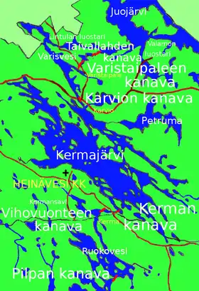 L'itinéraire inextricable de la voie navigable d'Heinävesi coupe la commune d'Heinävesi, et passe par les lacs Kallavesi, Varisvesi (fi), Kermajärvi, Ruokovesi (sv), Joutenvesi et Haukivesi[3]. La chaîne lacustre se caractérise par des voies d'eau étroites et sinueuses, des lacs aux îles nombreuses et par six canaux à écluse deux canaux sans écluse[3].