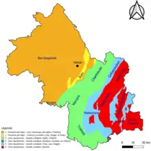 Le département de l'Isère, dans lequel se situe le territoire de la commune de Voiron, est localisé dans les Alpes occidentales. Il s'étend, d'ouest en est, dans l'avant-pays alpin du Bas-Dauphiné, dans les Préalpes (massif de la Chartreuse et massif du Vercors) et dans les Alpes du Dauphiné (chaîne de Belledonne, massif des Grandes Rousses, massif des Écrins et Massif du Taillefer)[12]. Le bassin du Bas-Dauphiné fait partie du domaine géologique péri-alpin, appelé aussi domaine molasique péri-alpin. C'est un bassin sédimentaire datant du Tertiaire (Miocène) composé de couches de roches détritiques épaisses[12],[13].
