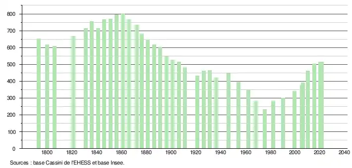 L'évolution du nombre d'habitants est connue à travers les recensements de la population effectués dans la commune depuis 1793. Pour les communes de moins de 10 000 habitants, une enquête de recensement portant sur toute la population est réalisée tous les cinq ans, les populations légales des années intermédiaires étant quant à elles estimées par interpolation ou extrapolation[17]. Pour la commune, le premier recensement exhaustif entrant dans le cadre du nouveau dispositif a été réalisé en 2005[18].