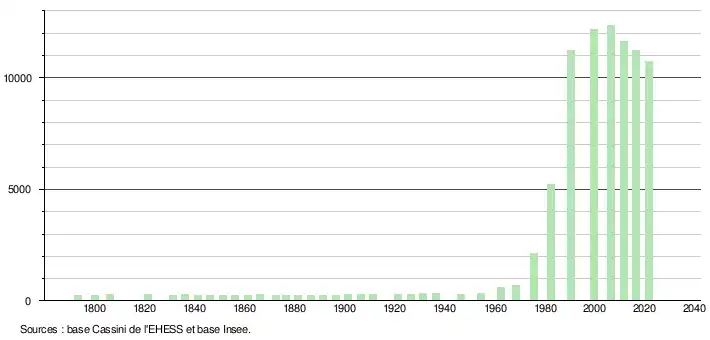 - Par convention dans Wikipédia, le principe a été retenu de n’afficher dans le tableau des recensements et le graphique, pour les populations légales postérieures à 1999, que les populations correspondant à une enquête exhaustive de recensement pour les communes de moins de 10 000 habitants, et que les populations des années 2006, 2011, 2016, etc. pour les communes de plus de 10 000 habitants, ainsi que la dernière population légale publiée par l’Insee pour l'ensemble des communes.