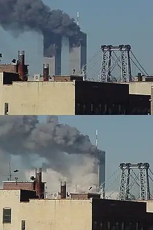 La tour Sud s'effondre avant la tour Nord, qui avait été frappée la première. En effet le vol 175 percuta la tour Sud à une vitesse supérieure au vol 11 ainsi qu'à une hauteur plus basse.