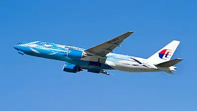 Le Boeing 777-200ER impliqué dans l'événement, vu dans les couleurs différentes de Malaysia Airlines.