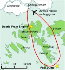 L'accident s'est produit le à 10 h 1 heure locale (2 h 1 UTC) alors que l'appareil redécollait de Singapour en direction de Sydney. Quatre minutes après le décollage, en pleine phase de montée au-dessus de l'île indonésienne de Batam, l'explosion non contenue du disque de la turbine à pression intermédiaire du réacteur no 2 a provoqué de nombreux dégâts sur l’aile gauche[4]. La projection de débris et de morceaux de disque a détruit le carénage du réacteur, perforé l'aile et endommagé le système d’approvisionnement en kérosène. Les débris ont également désactivé un des systèmes hydrauliques et les freins anti-blocage, mis les réacteurs no 1 et no 4 en mode dégradé, endommagé le fonctionnement des dispositifs hypersustentateurs de l'aile gauche et le système de contrôle du réacteur no 1[5].