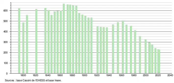 L'évolution du nombre d'habitants est connue à travers les recensements de la population effectués dans la commune depuis 1793. Pour les communes de moins de 10 000 habitants, une enquête de recensement portant sur toute la population est réalisée tous les cinq ans, les populations légales des années intermédiaires étant quant à elles estimées par interpolation ou extrapolation[13]. Pour la commune, le premier recensement exhaustif entrant dans le cadre du nouveau dispositif a été réalisé en 2005[14].
