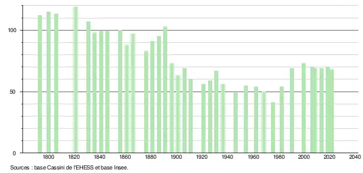 L'évolution du nombre d'habitants est connue à travers les recensements de la population effectués dans la commune depuis 1793. Pour les communes de moins de 10 000 habitants, une enquête de recensement portant sur toute la population est réalisée tous les cinq ans, les populations légales des années intermédiaires étant quant à elles estimées par interpolation ou extrapolation[22]. Pour la commune, le premier recensement exhaustif entrant dans le cadre du nouveau dispositif a été réalisé en 2008[23].