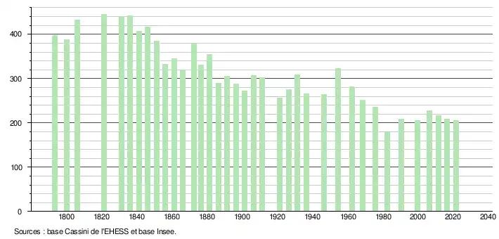 L'évolution du nombre d'habitants est connue à travers les recensements de la population effectués dans la commune depuis 1793. Pour les communes de moins de 10 000 habitants, une enquête de recensement portant sur toute la population est réalisée tous les cinq ans, les populations légales des années intermédiaires étant quant à elles estimées par interpolation ou extrapolation[14]. Pour la commune, le premier recensement exhaustif entrant dans le cadre du nouveau dispositif a été réalisé en 2006[15].