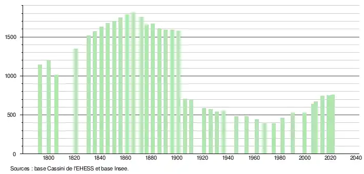L'évolution du nombre d'habitants est connue à travers les recensements de la population effectués dans la commune depuis 1793. Pour les communes de moins de 10 000 habitants, une enquête de recensement portant sur toute la population est réalisée tous les cinq ans, les populations légales des années intermédiaires étant quant à elles estimées par interpolation ou extrapolation[17]. Pour la commune, le premier recensement exhaustif entrant dans le cadre du nouveau dispositif a été réalisé en 2008[18].
