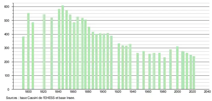 L'évolution du nombre d'habitants est connue à travers les recensements de la population effectués dans la commune depuis 1793. Pour les communes de moins de 10 000 habitants, une enquête de recensement portant sur toute la population est réalisée tous les cinq ans, les populations légales des années intermédiaires étant quant à elles estimées par interpolation ou extrapolation[35]. Pour la commune, le premier recensement exhaustif entrant dans le cadre du nouveau dispositif a été réalisé en 2007[36].