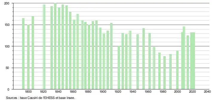 L'évolution du nombre d'habitants est connue à travers les recensements de la population effectués dans la commune depuis 1793. Pour les communes de moins de 10 000 habitants, une enquête de recensement portant sur toute la population est réalisée tous les cinq ans, les populations légales des années intermédiaires étant quant à elles estimées par interpolation ou extrapolation[16]. Pour la commune, le premier recensement exhaustif entrant dans le cadre du nouveau dispositif a été réalisé en 2008[17].