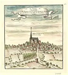 « Vue du bourg de Voves. En Beauce, sur le grand chemin de Chartres à Orléans, à une lieue de Beauvilliers. 1696 »