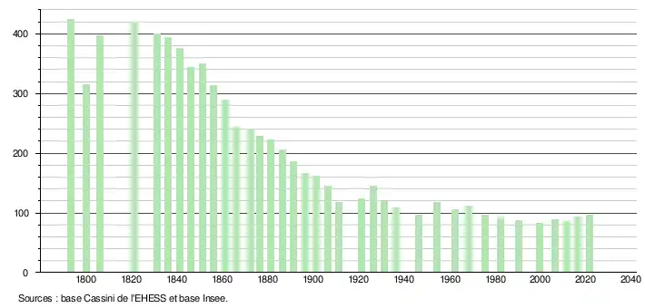 L'évolution du nombre d'habitants est connue à travers les recensements de la population effectués dans la commune depuis 1793. Pour les communes de moins de 10 000 habitants, une enquête de recensement portant sur toute la population est réalisée tous les cinq ans, les populations légales des années intermédiaires étant quant à elles estimées par interpolation ou extrapolation[23]. Pour la commune, le premier recensement exhaustif entrant dans le cadre du nouveau dispositif a été réalisé en 2006[24].