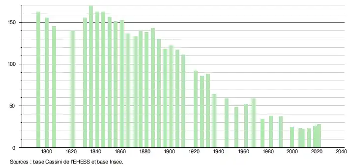 L'évolution du nombre d'habitants est connue à travers les recensements de la population effectués dans la commune depuis 1793. Pour les communes de moins de 10 000 habitants, une enquête de recensement portant sur toute la population est réalisée tous les cinq ans, les populations légales des années intermédiaires étant quant à elles estimées par interpolation ou extrapolation[14]. Pour la commune, le premier recensement exhaustif entrant dans le cadre du nouveau dispositif a été réalisé en 2008[15].
