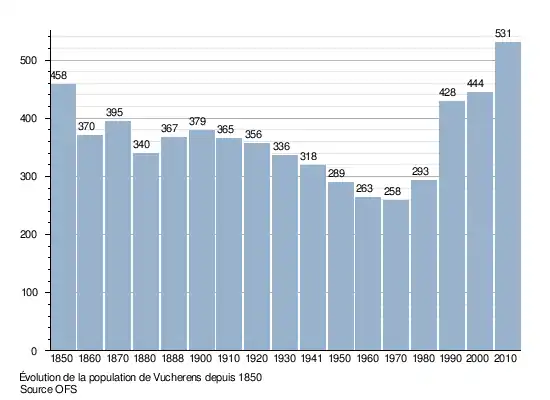 La population de Vucherens est de 458 habitants en 1850, puis de 370 dix ans plus tard. Après une période stable jusqu'en 1900, elle baisse lentement jusqu'à 258 habitants en 1970. Elle remonte à 293 en 1980 avant une hausse de 46 % en 10 ans jusqu'à 428 personnes. Le graphique suivant résume l'évolution de la population de Vucherens entre 1850 et 2010[12] :