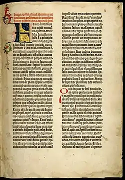 C'est à Gutenberg qu'on doit le fait que le premier livre imprimé en Europe est la Vulgate ; Gutenberg réalise cette impression entre 1452 et 1455. Pour cette première édition, qui comporte deux volumes in-folio sans adresse ni date et ne fut précisément identifiée qu'au XVIIIe siècle par le bibliographe français François Debure[40], on parle de « Bible à 42 lignes » d'après le nombre de lignes qu'elle comprend par pages, présentées en deux colonnes[41].