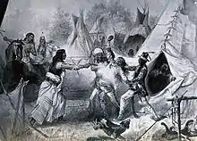 « Blue Horse a lancé une violente harangue en langue sioux. Il avait un fusil dans une main et un arc tendu et un tas de flèches dans l'autre, et quand il a laissé tomber sa couverture, deux Colts de la marine et un gros couteau scalpeur pouvaient être vus dans leur fourreau à sa ceinture. Il était dans une fureur délirante, bondissant dans la pièce alors qu'il lançait des accusations et des menaces contre le chef Spotted Tail. Le chef Big Mouth est mort vers l'aube. Quelques heures plus tard, Blue Horse est venu au bureau de l'agent Poole et lui a dit qu'il se sentait si triste de la mort de son grand et bon frère qu'il devrait laver la peinture qu'il avait mise sur son visage pour la fête de la veille et commencer le deuil. L'interprète a averti Poole que si cet Indien se lavait le visage et se mettait à pleurer, cela signifierait la réouverture de la querelle et d'autres fusillades. L'agent donnerait à Blue Horse deux couvertures, ce qui le réconforterait, et il s'abstiendrait de se laver le visage et de s'en prendre à Spotted Tail . Les couvertures ont été remises et le frère en deuil est parti tranquillement. »