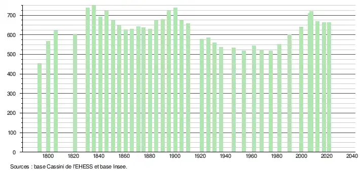 L'évolution du nombre d'habitants est connue à travers les recensements de la population effectués dans la commune depuis 1793. Pour les communes de moins de 10 000 habitants, une enquête de recensement portant sur toute la population est réalisée tous les cinq ans, les populations légales des années intermédiaires étant quant à elles estimées par interpolation ou extrapolation[16]. Pour la commune, le premier recensement exhaustif entrant dans le cadre du nouveau dispositif a été réalisé en 2007[17].