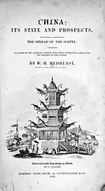 - W. H. Medhurst, China : its state and prospects, with special reference to the spread of the gospel; containing allusions to the antiquity, extent, population, civilization, literature, and religion of the Chinese, Boston, Crocker & Brewster, (OCLC 5314739, lire en ligne)