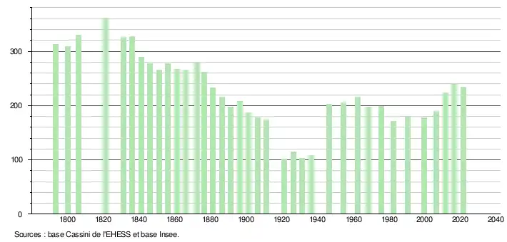 L'évolution du nombre d'habitants est connue à travers les recensements de la population effectués dans la commune depuis 1793. Pour les communes de moins de 10 000 habitants, une enquête de recensement portant sur toute la population est réalisée tous les cinq ans, les populations légales des années intermédiaires étant quant à elles estimées par interpolation ou extrapolation[23]. Pour la commune, le premier recensement exhaustif entrant dans le cadre du nouveau dispositif a été réalisé en 2006[24].