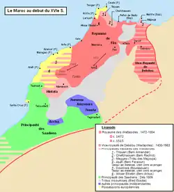 Reconnaissant d'abord nominalement l'autorité centrale des Wattassides, les Saadiens, qui prennent Marrakech en 1524 et en font leur capitale, entrent en confrontation avec les premiers dès 1528[26] et, à la suite d'une bataille à l'issue indécise, se voient confirmer leur autorité sur le Sud du Maroc par le traité de Tadla.