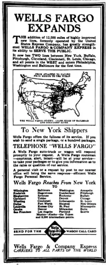 En 1918, les activités de Wells Fargo dans les transports sont nationalisées en même temps que celles d'Adams Express, du Southern Express et d'American Express pour former la Railway Express Agency.