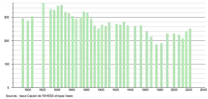 L'évolution du nombre d'habitants est connue à travers les recensements de la population effectués dans la commune depuis 1793. Pour les communes de moins de 10 000 habitants, une enquête de recensement portant sur toute la population est réalisée tous les cinq ans, les populations légales des années intermédiaires étant quant à elles estimées par interpolation ou extrapolation[25]. Pour la commune, le premier recensement exhaustif entrant dans le cadre du nouveau dispositif a été réalisé en 2006[26].