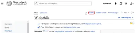 Sur chaque page, des onglets permettent d'accéder aux fonctions de modification, soit par l'intermédiaire d'un éditeur visuel, soit par l'intermédiaire du code source, le wikicode[Note 16]. Un historique permet de lister les auteurs et de consulter les modifications successives de l'article par ses rédacteurs. Ces modifications sont identifiées par l'adresse IP du rédacteur ou par son pseudonyme s'il s'est préalablement identifié[44].