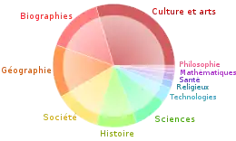 Des analyses statistiques menées par des chercheurs de l'université Carnegie-Mellon et du Palo Alto Research Center étudient l'état de la couverture thématique de Wikipédia en anglais en [45]. La répartition montre une nette prédominance des articles culturels. Les pourcentages qui suivent sont ceux de janvier 2008, les variations entre parenthèses représentent leur évolution depuis juillet 2006. Dans l'intervalle, le nombre de pages et de catégories a plus que doublé :