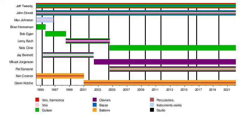 Wilco est un groupe de rock, folk rock et country rock contemporain américain originaire de Chicago (Illinois) issu en 1994 des cendres du groupe américain de country alternative Uncle Tupelo. La composition du groupe évolue fréquemment durant ses premières années, seuls le leader et chanteur Jeff Tweedy et le bassiste John Stirratt restant présents depuis l'origine. À partir de 2004, Wilco se stabilise sous forme de sextet avec, en plus de Tweedy et Stirratt, Nels Cline à la guitare, Glenn Kotche aux percussions, le multi-instrumentiste Pat Sansone et le pianiste Mikael Jorgensen. Durant sa carrière, Wilco publie onze albums studio, un double album live et des albums en collaboration avec Billy Bragg et The Minus 5.