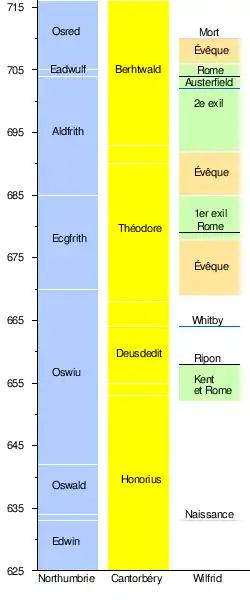 Originaire de Northumbrie, Wilfrid bénéficie dans sa jeunesse du soutien de la reine Eanflæd et étudie à Lindisfarne et à Canterbury avant de se rendre sur le continent pour poursuivre sa formation à Lyon et à Rome. De retour en Angleterre, il joue un rôle important dans l'adoption de la méthode romaine du calcul de la date de Pâques lors du concile de Whitby en 664. Nommé évêque d'York la même année, il ne le devient effectivement qu'en 669 et fait preuve d'une grande activité dans son diocèse en fondant plusieurs églises et monastères. L'important pouvoir qu'il détient en tant que seul évêque du Nord de l'Angleterre suscite la méfiance du roi Ecgfrith et de l'archevêque Théodore de Tarse, qui le dépose en 678. Après avoir fait appel en vain au pape, Wilfrid s'exile dans le royaume de Sussex, où il entreprend la conversion des Saxons du Sud et fonde l'évêché de Selsey.