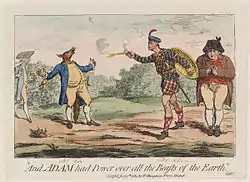 Adam déteste particulièrement la figure de proue de l'opposition Charles James Fox. À un moment donné, ils se battent en duel. Il attaque également Fox verbalement au Parlement.