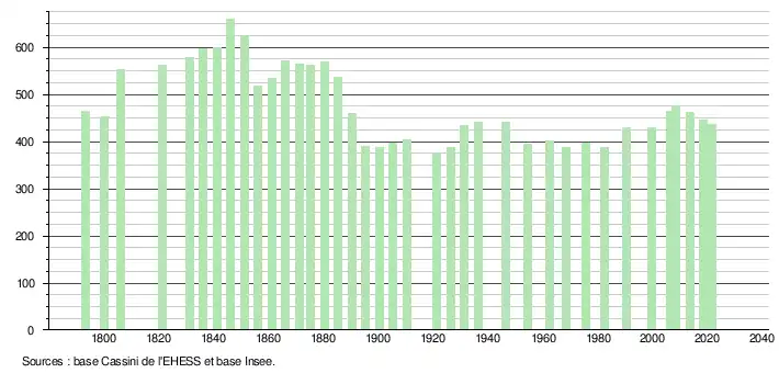 L'évolution du nombre d'habitants est connue à travers les recensements de la population effectués dans la commune depuis 1793. Pour les communes de moins de 10 000 habitants, une enquête de recensement portant sur toute la population est réalisée tous les cinq ans, les populations légales des années intermédiaires étant quant à elles estimées par interpolation ou extrapolation[15]. Pour la commune, le premier recensement exhaustif entrant dans le cadre du nouveau dispositif a été réalisé en 2008[16].