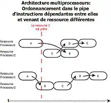 Le pipeline permet la parallélisation des instructions dans le but d’accroître les performances du processeur. Grâce à plusieurs étages dans le pipeline, les instructions peuvent se chevaucher ce qui induit que le temps d’exécution d’un ensemble d’instructions ne peut pas être égal à la somme des temps de chacune de ces instructions. Le calcul du WCET des instructions se fait via une représentation de l’occupation du pipeline par le remplissage de tables de réservation pendant l’exécution de ces instructions simulant ainsi les états d’occupation des étages du pipeline. Une étude de Metzlaff montre et quantifie l'impact des anomalies mémoires sur le calcul[67]. Comme pour l'analyse des caches, on peut retrouver cette méthode dans beaucoup d'outils[68],[69] et travaux[70],[71],[72]. Un cas d'anomalie de timing est illustré ci-contre dans le schéma "Anomalie causée par ordonnancement (pipeline)". Dans cette illustration, considérons que les instructions A, D et E ne peuvent s’exécuter que sur la ressource processeur 1, et que les instructions B et C ne peuvent s’exécuter que sur la ressource processeur 2. Le premier ordonnancement se montre optimal car C peut enchaîner avec les instructions D et E avant que l’instruction A n’enchaîne avec l’instruction B. Dans le deuxième ordonnancement, l’instruction A, exécutée sur la ressource processeur 1 et se terminant avant que la ressource C ne soit prête, va alors enchaîner sur l’instruction B sur la ressource processeur 2. Mais cette dernière instruction va bloquer le départ de l’instruction C car elle aussi ne peut s’exécuter que sur la ressource processeur 2 décalant ainsi le départ des instructions D et E suivantes sur la ressource processeur 1. L’ordonnancement est par conséquent plus long.
