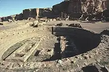 - 950-1150 : prospérité du Chaco Canyon au Nouveau-Mexique[10]. Après 1050, les Anasazis (Arizona) quittent leurs villages établis dans les vallées ou sur les plateaux de lœss et déplacent leurs populations vers des sites défensifs (Pueblo Bonito dans le canyon de Chaco). Le site de Pueblo Bonito se développe[11]. Sa population, de 1 200 âmes environ, se répartit dans les 800 salles aménagées sur quatre étages, à l’abri de hauts murs. Le canyon compte plus de 400 km de routes et de passages.