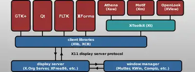 - un ou plusieurs logiciels client X, depuis des ordinateurs locaux ou distants (logiciel graphique) se connectent au serveur X et lui envoient leurs requêtes d'affichage en utilisant le protocole X au travers de la bibliothèque X (Xlib). Le client est simplement l'application logicielle (jeu, traitement de texte, calculatrice…) qui utilise alors le protocole X pour déléguer au serveur X les tâches d'interactions homme-machine (ou IHM).