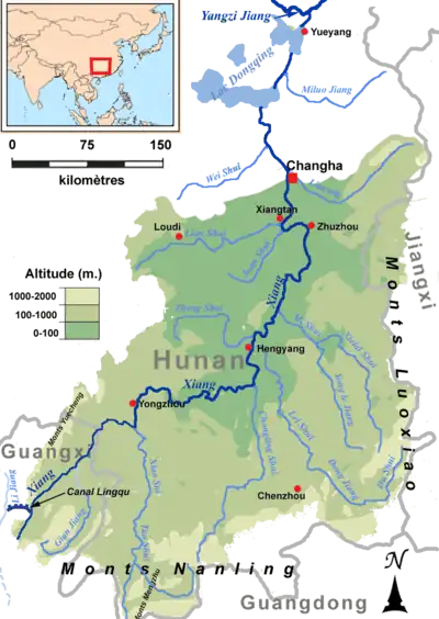 |   Carte (en anglais) situant et montrant le bassin de la rivière Xiang | |